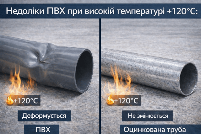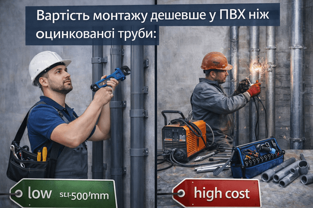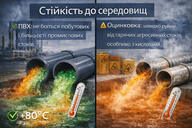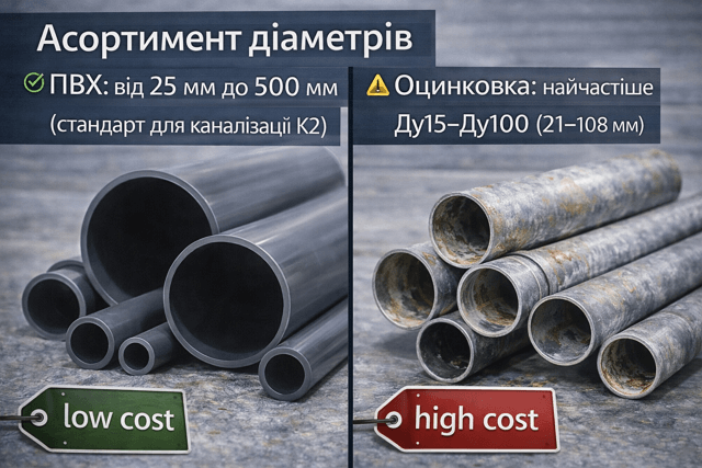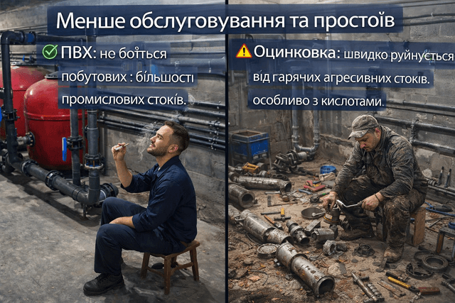 В большинстве задач канализации и технических стоков ПВХ выгоднее "по тоталу" (материал + монтаж + эксплуатация). Оцинкованная труба обычно уместна там, где ключевой фактор – температура или механическая прочность узла.