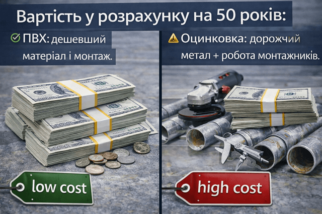 | Статья расходов | ПВХ (PVC) | Оцинкованная труба | Что это значит для бюджета |